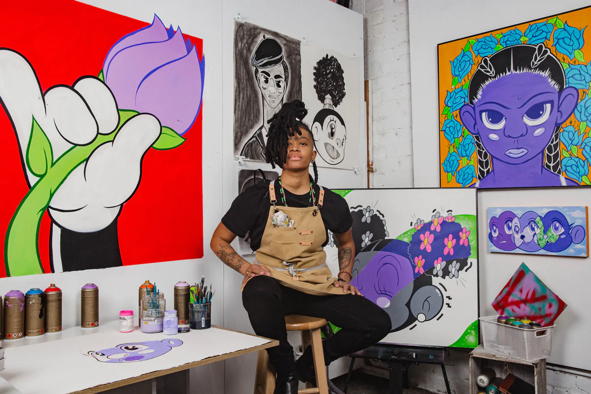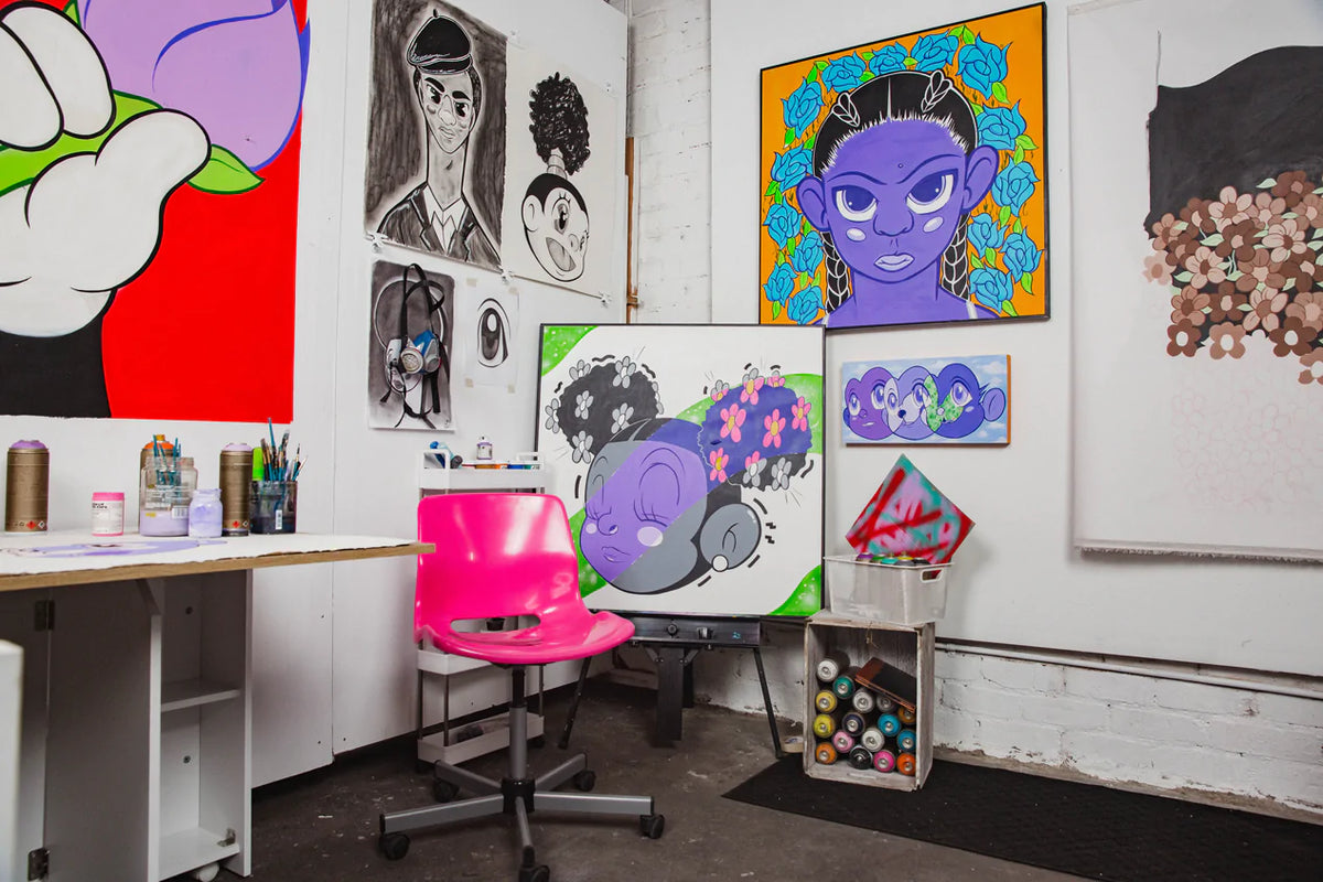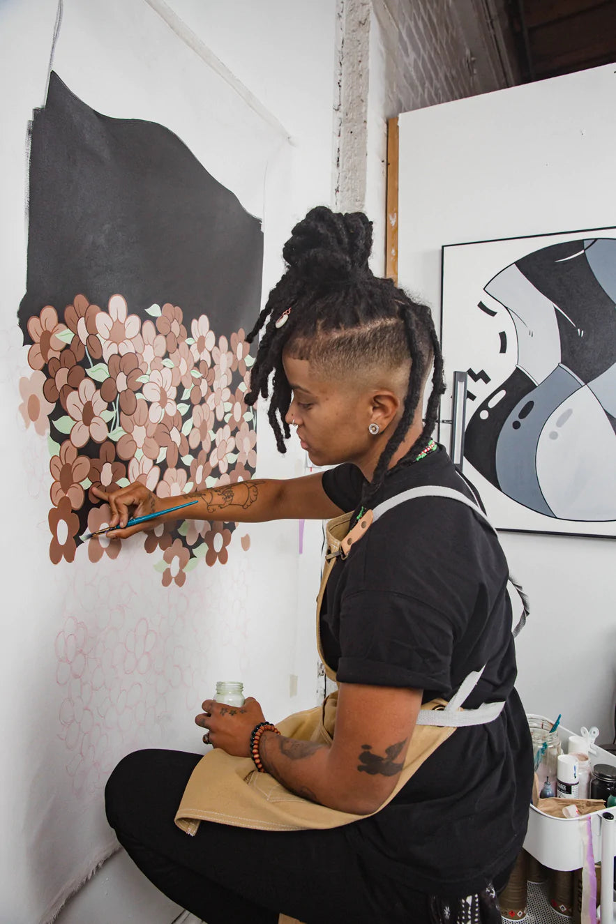 SW: Flowers are symbolic of so many things. Just speaking to Murakami, why he chooses flowers to be his iconic thing is because they resemble so much. The style and the interpretation of the flowers that I have is that I wanted to use the colors of people’s skin versus just using pinks and purples and blues. I wanted to think of it in a way where what if we ourselves were flowers in this world. Then taking those colors which would usually be used when painting flowers and putting that into the color of the characters’ skins. That's why I paint my characters using purples, also because purple also has its own symbolism of royalty as well. So yeah, when it comes to flowers, it's really about considering or thinking specifically about us Black people in this world as flowers or in a garden.